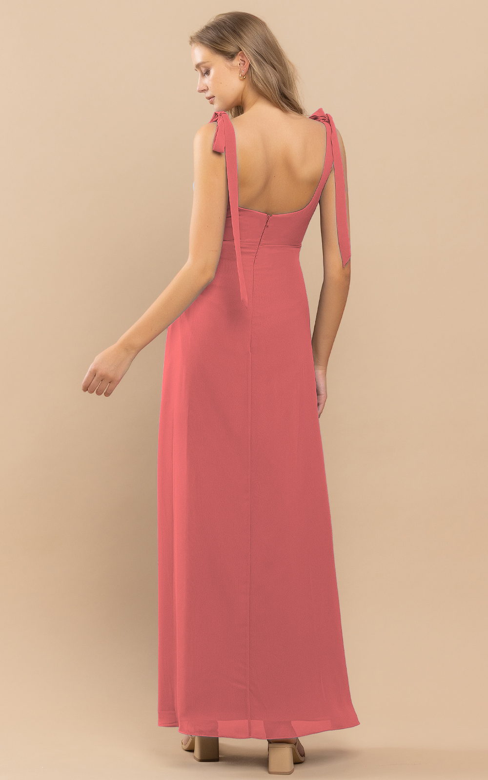 Girly, feminine, and chic! Berenice allure is a floor-length chiffon dress that's perfect for spring season. The square neckline and the removable charming bow-embellished straps flatter your collarbone and shoulders. The dress is made in a chic sheath column silhouette, featuring a side slit . The low scoop back make it a timeless beauty we can't say no to!