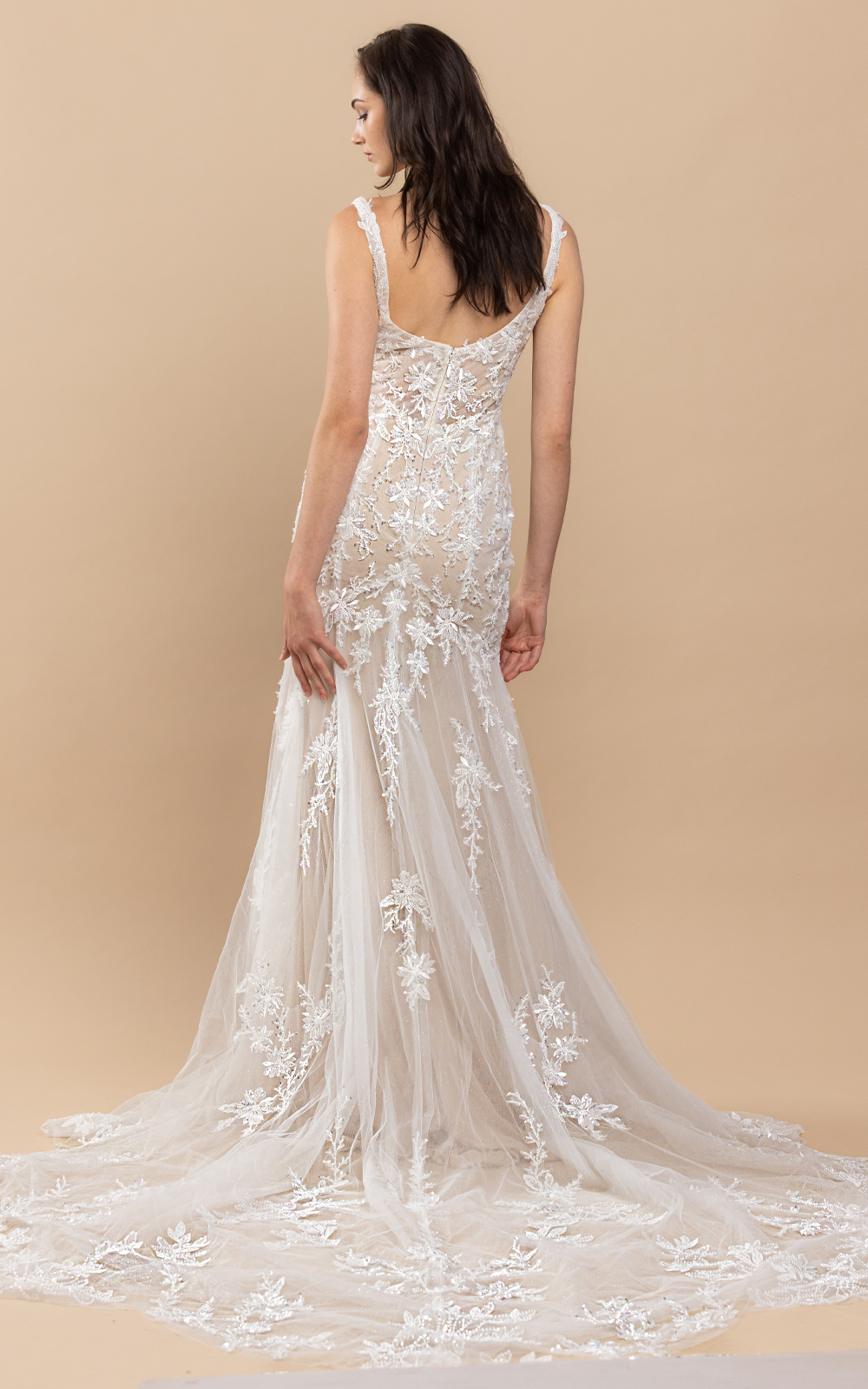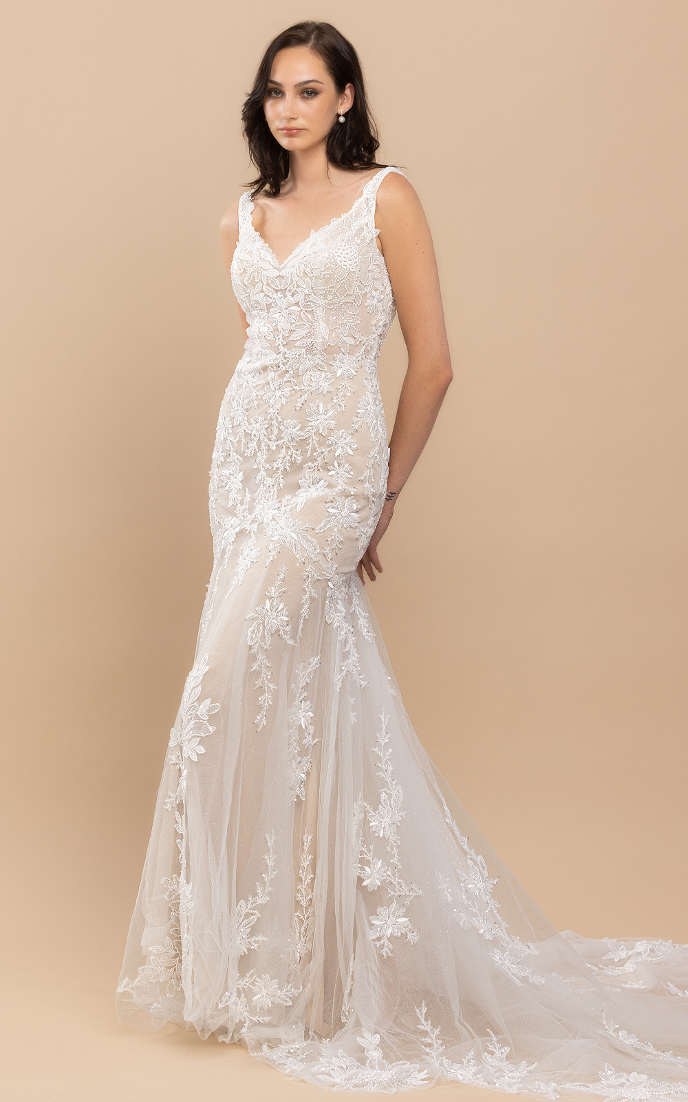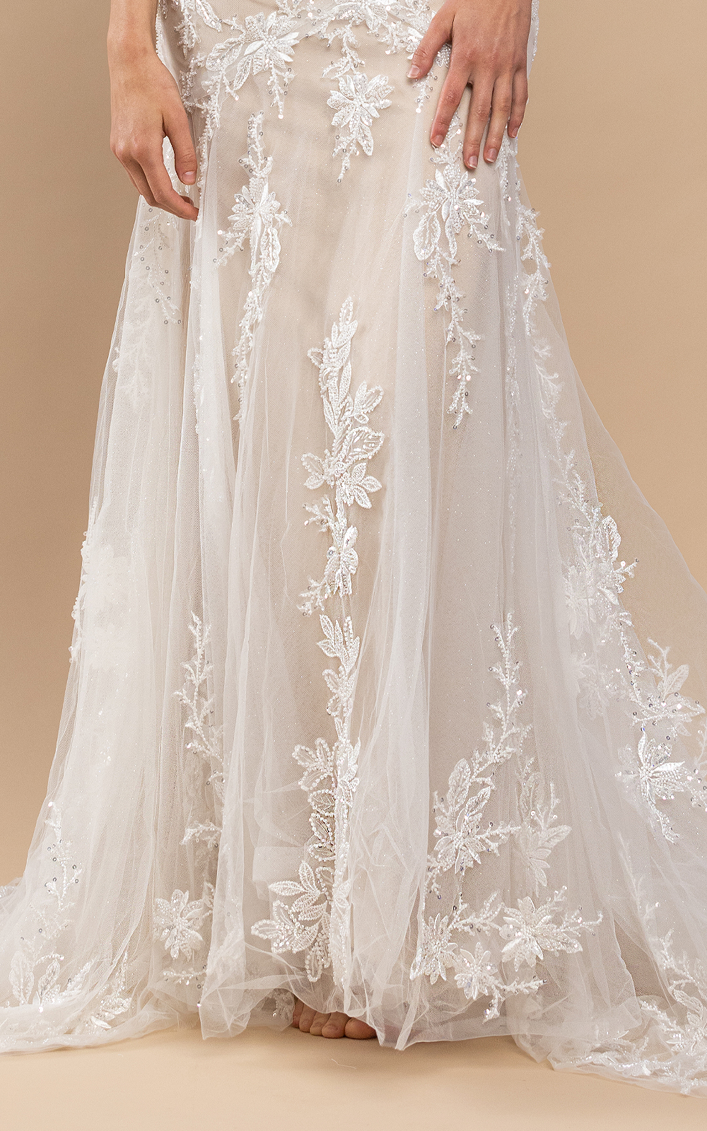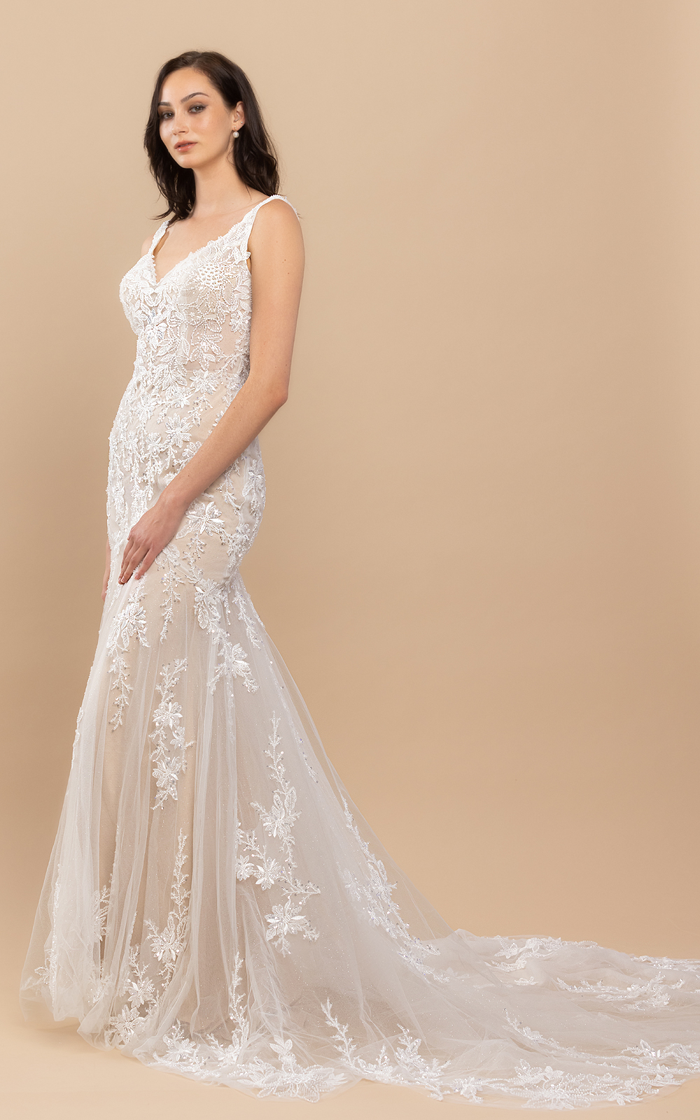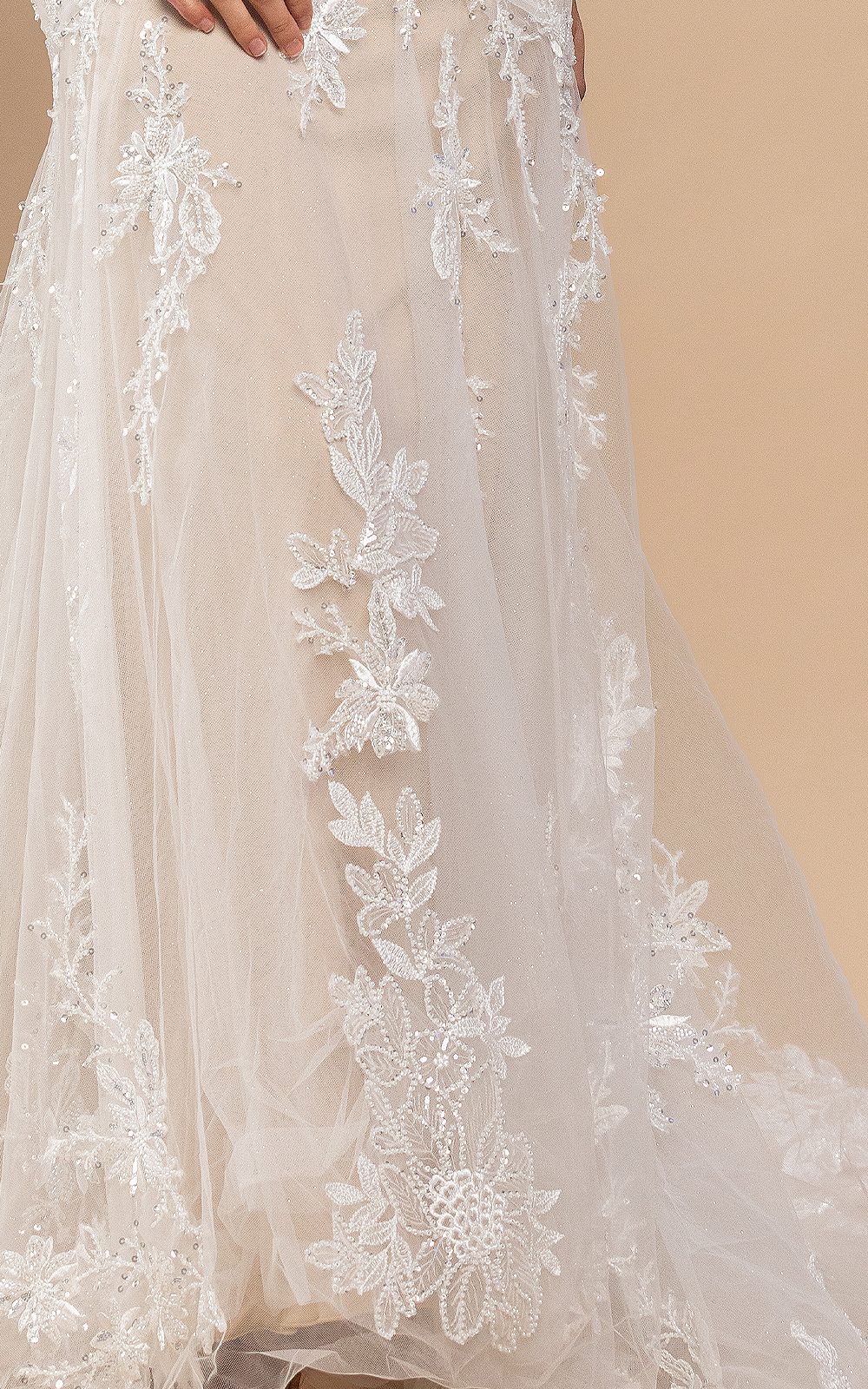 Make a statement on your big day with our glamorous and chic-modern wedding dress. The royal train exudes grandeur and elegance, while the exquisite combination of lace, Italian tulle, and jersey fabrics creates a luxurious and sophisticated look. The sleeveless design and V-neckline highlight your shoulders and collarbone, adding a touch of allure. The fit &flare silhouette accentuates your curves, making you feel like a true queen. Adorned with pleats, lace, beads, and sequins, this dress sparkles with every step you take. The back zip and V-back style provide a secure and stylish fit. With padding and boning for support and comfort, this dress ensures you look and feel your best. Embrace the glamorous and modern style on your special day with this stunning wedding dress.
