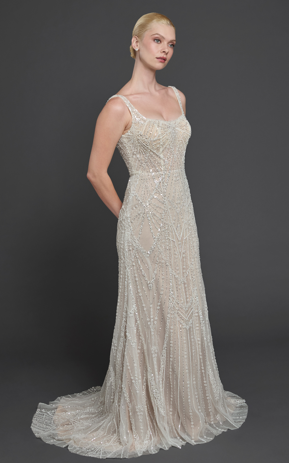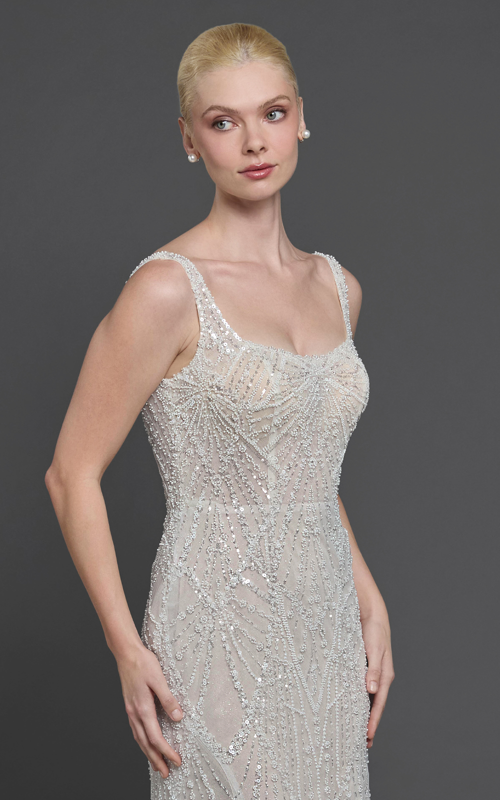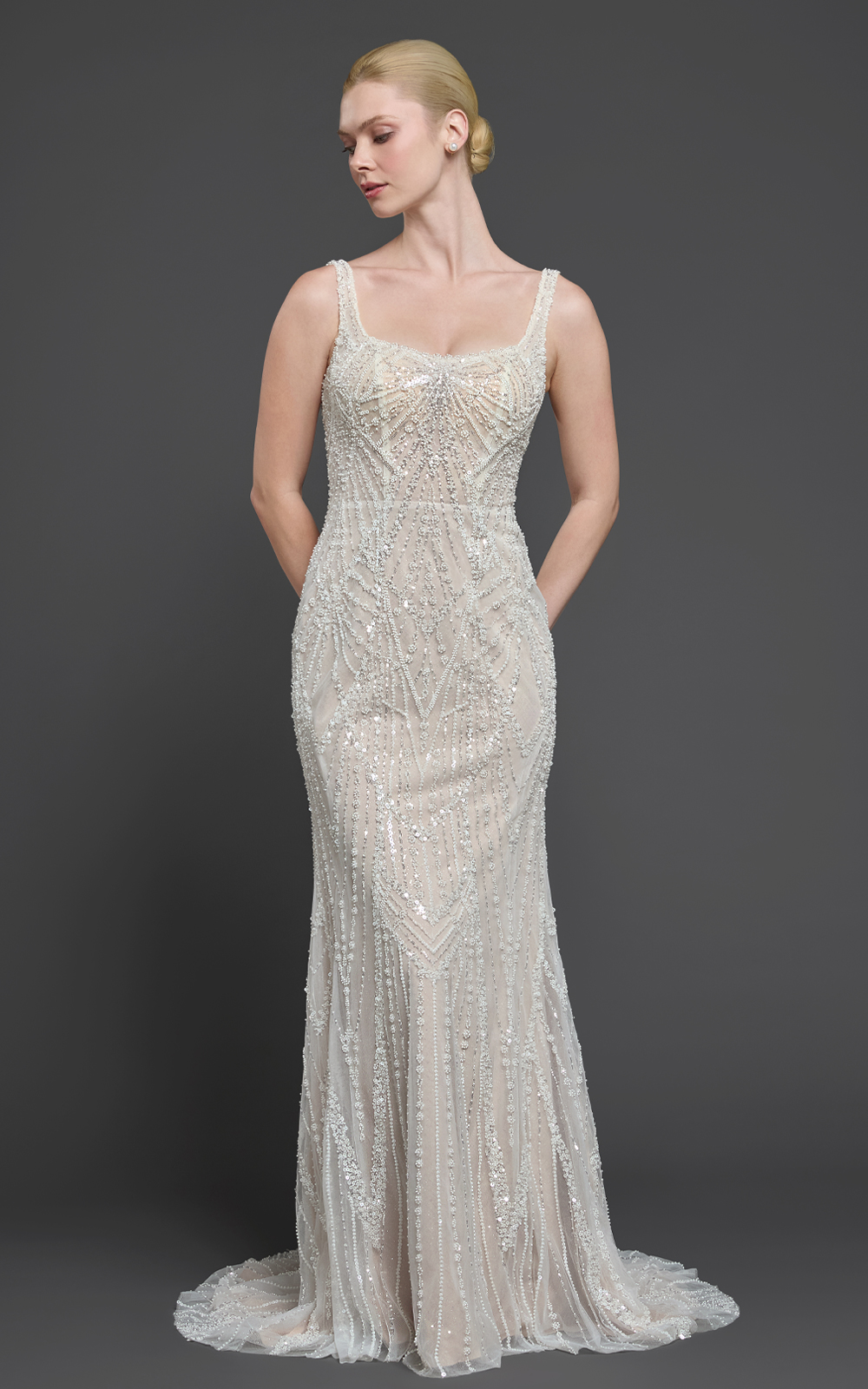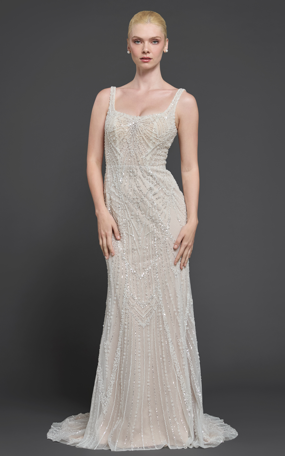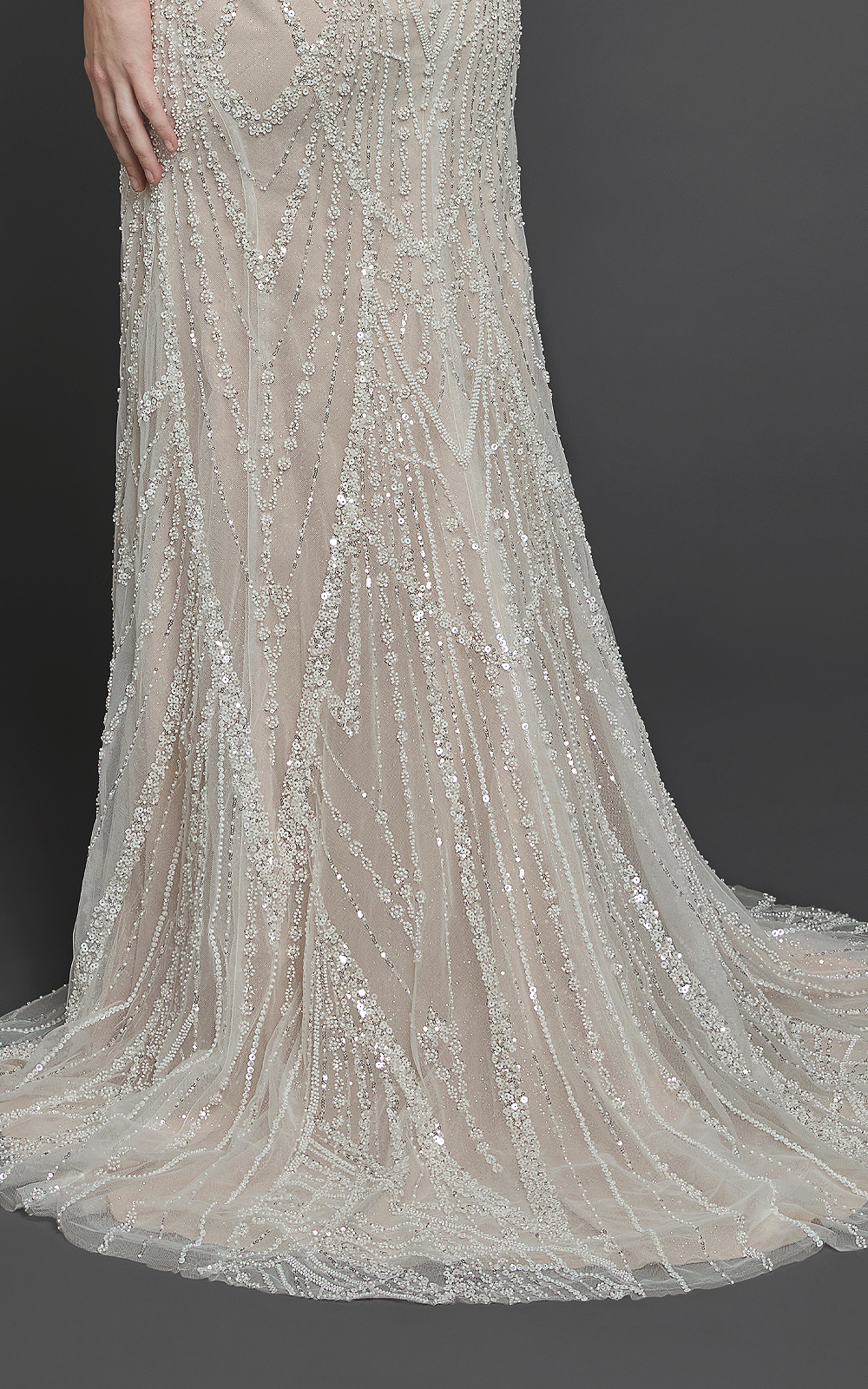 Step into Jazz Age glamour with Leila, a shimmering fit-and-flare gown perfect for modern rooftop weddings. Its champagne-nude underlayer enhances the glow of the all-over sequin tulle, while the square neckline flatters your shoulders beautifully. A sleek zipper back makes dressing effortless, and the light sweep train adds chic elegance without sacrificing comfort—ideal for brides who want to dance all night.