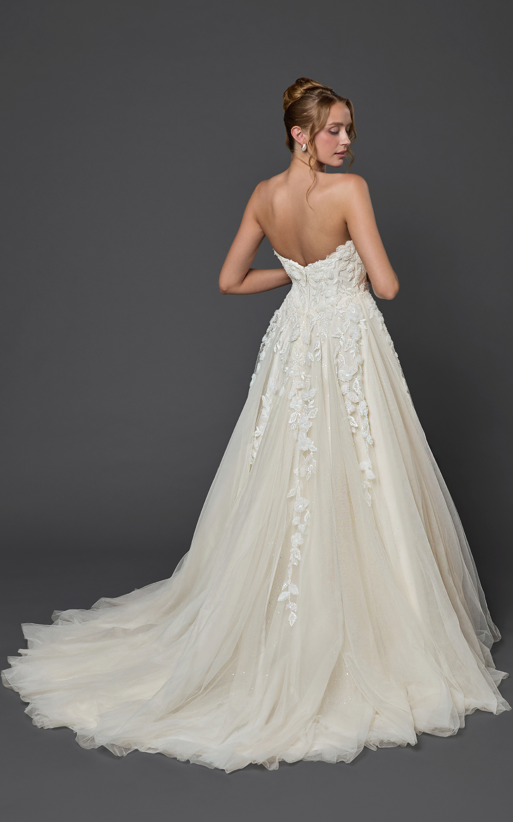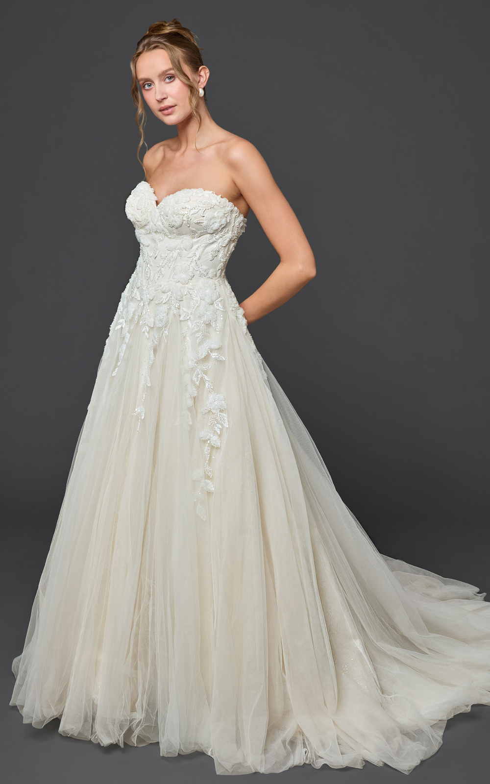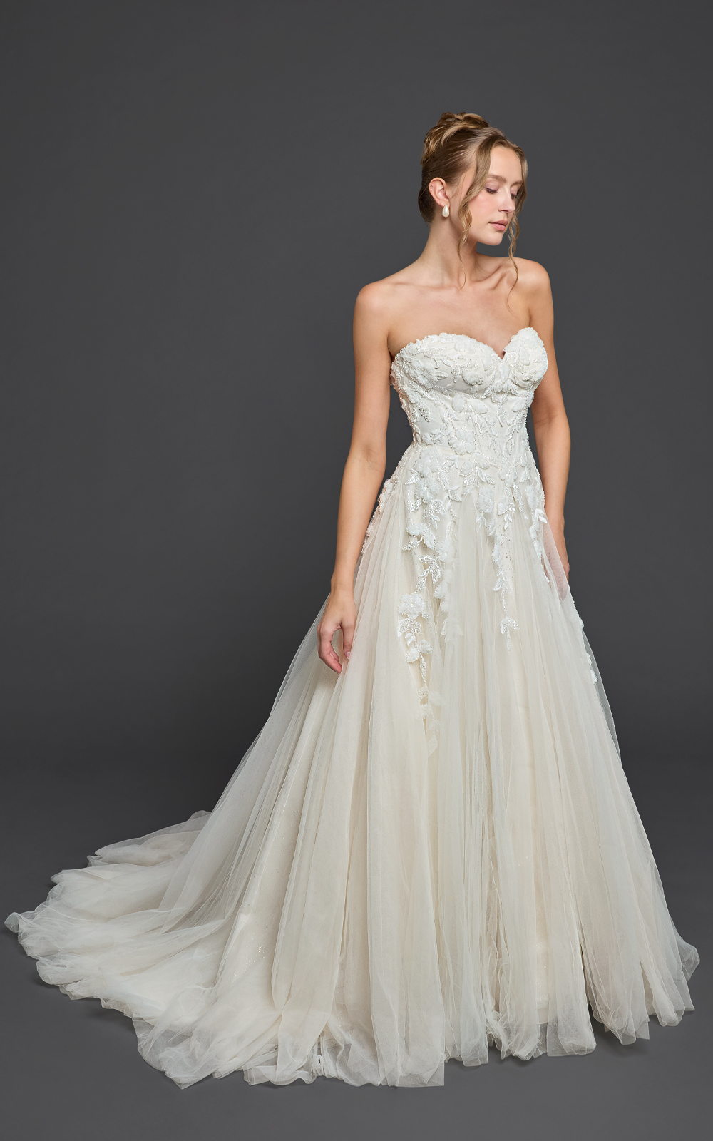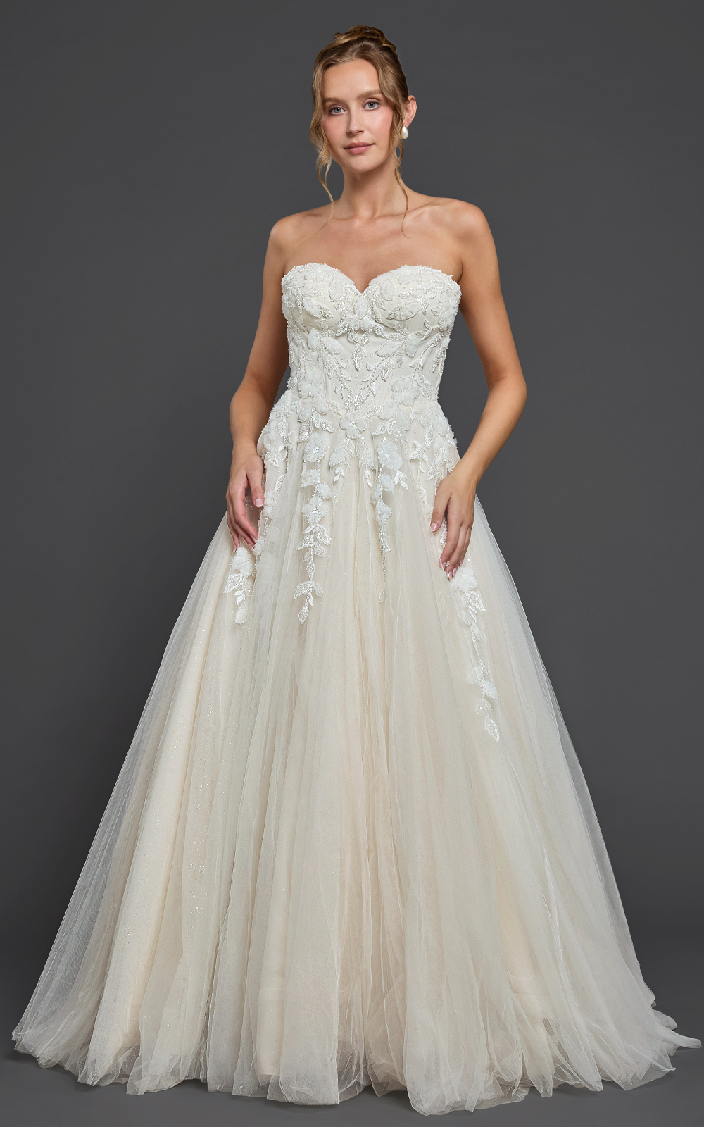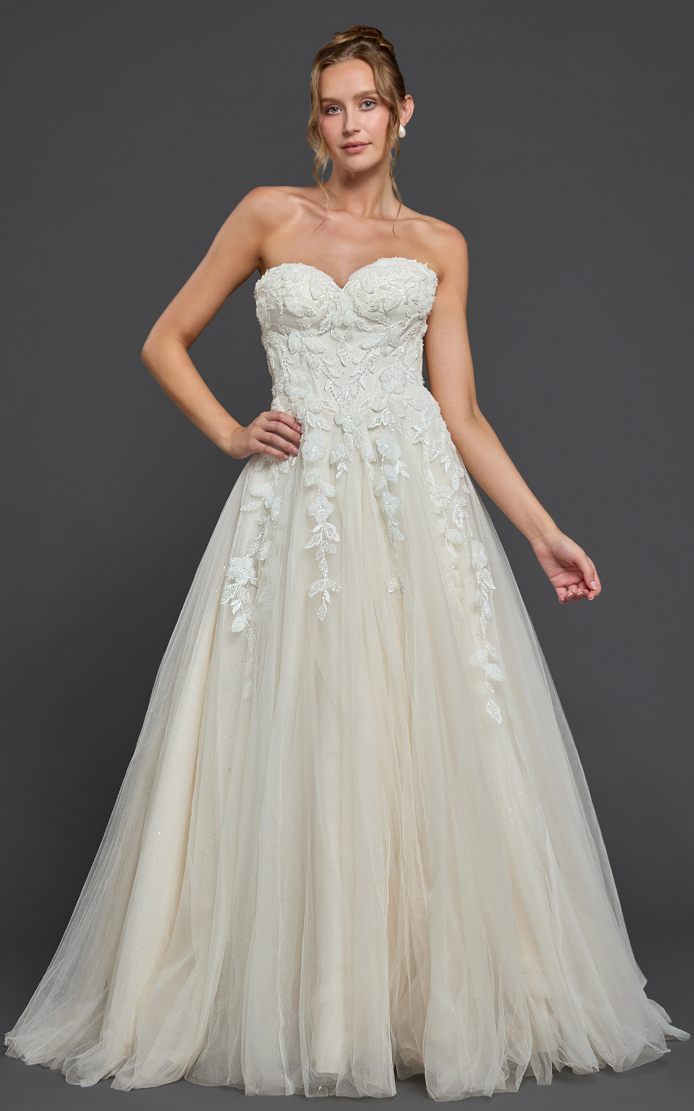 Meet Sabrina, a dreamy ball gown crafted with soft layers of tulle for a romantic, floating effect. The strapless sweetheart bodice is adorned with lace that cascades to the thigh, while the sparkled tulle skirt adds magical shimmer—perfect for your first dance. Finished with a graceful chapel train, this gown blends elegance and enchantment effortlessly.