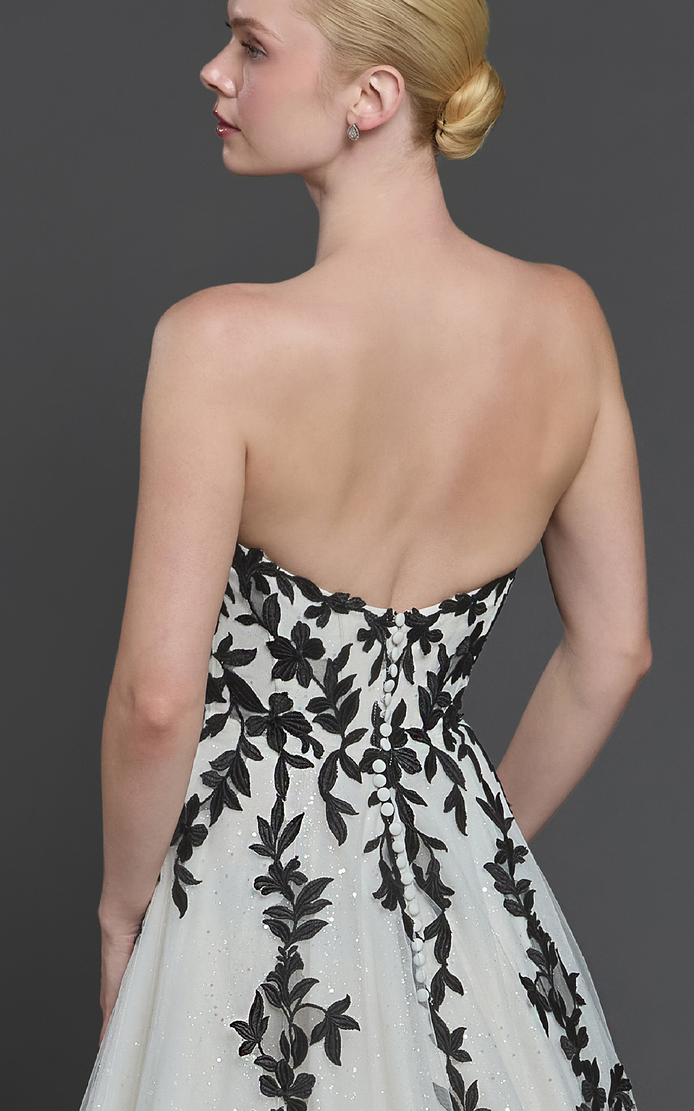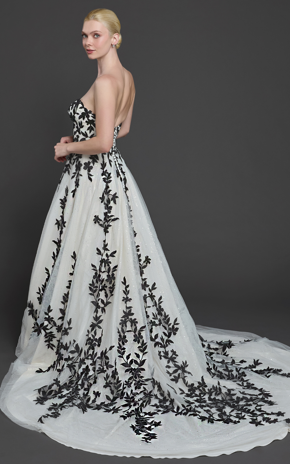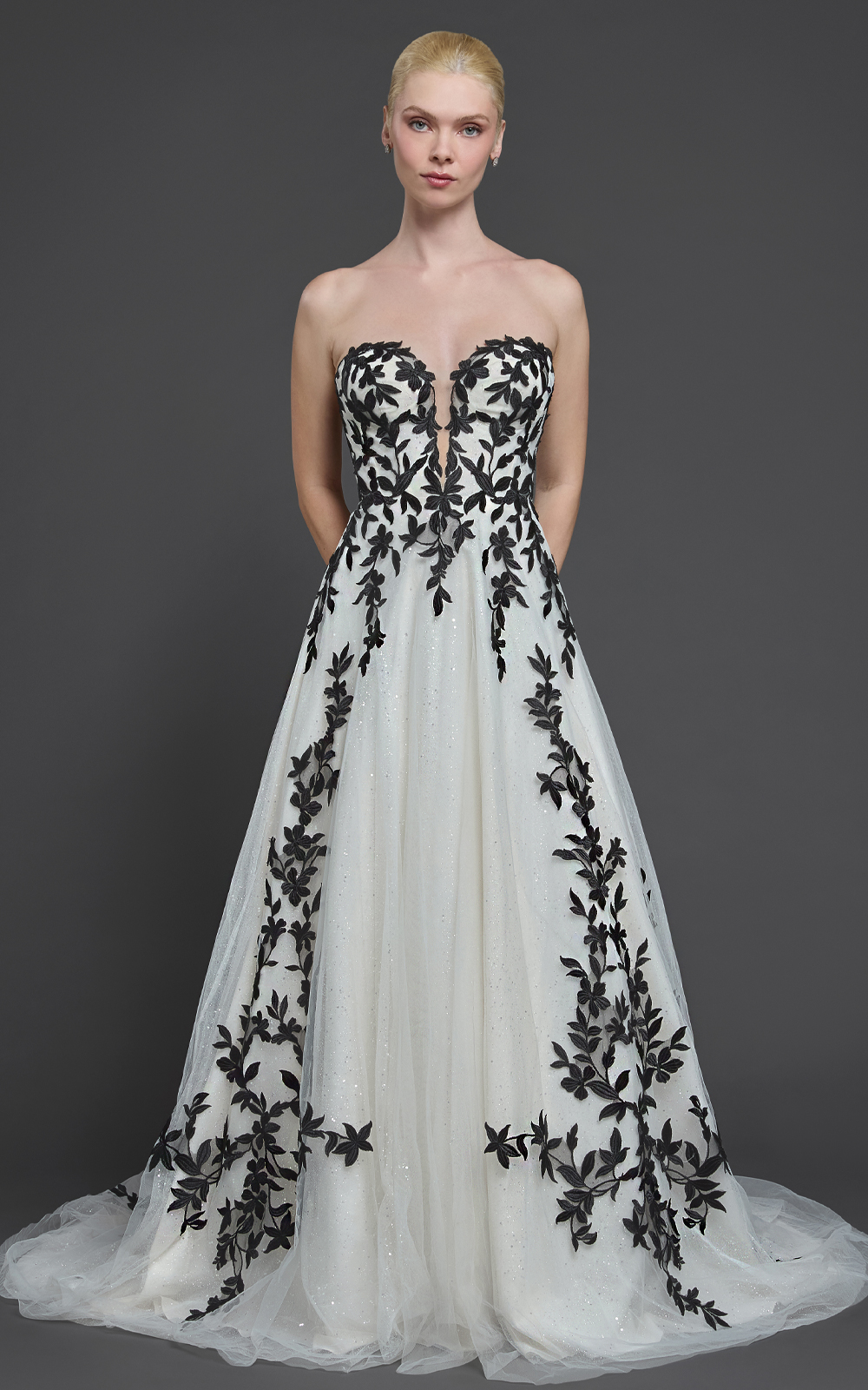 Celebrate your unique love story with Easton, a black-and-white A-line gown for brides who want a classic silhouette with a bold twist. Black lace adorns the sweetheart bodice and flows elegantly to the hem, while the dramatic cathedral train adds regal Victorian charm.