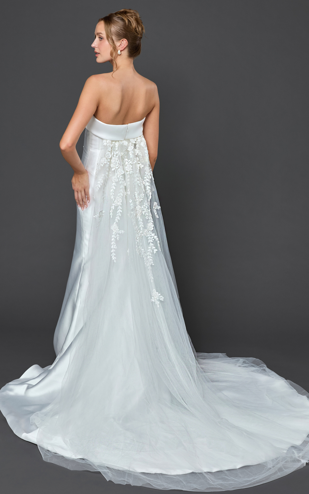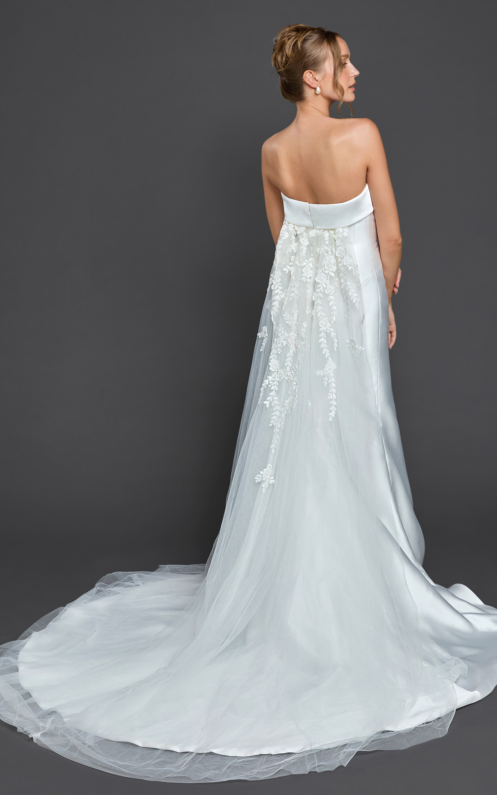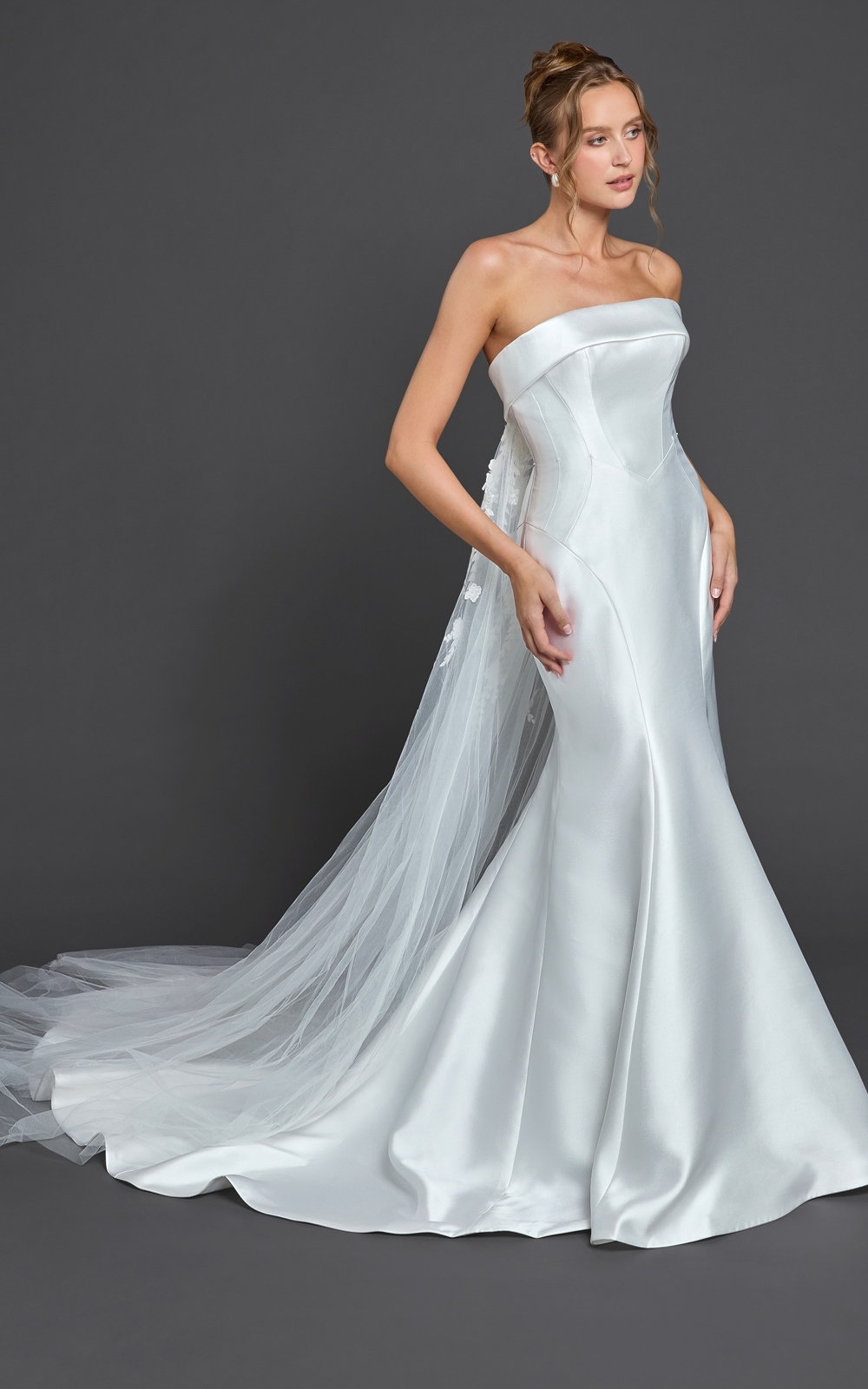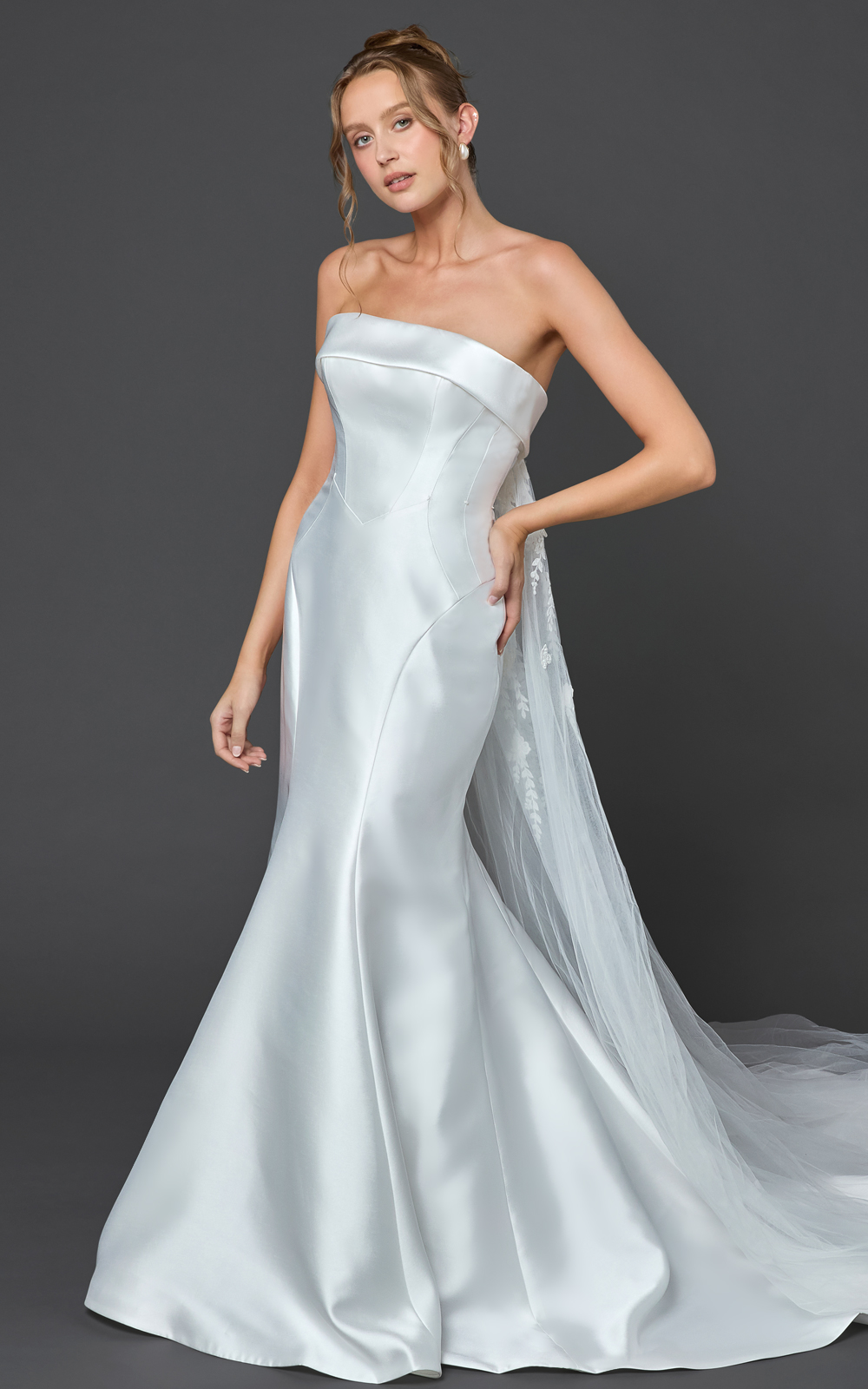 Make a bold entrance with Lexie B, the sleek mermaid gown designed to show off every curve. Crafted in smooth, luxurious Mikado, this strapless beauty features a clean straight neckline and a dramatic cathedral train—perfect for brides who want a modern, unforgettable walk down the aisle. Adding a detachable romantic tulle train for extra chic!